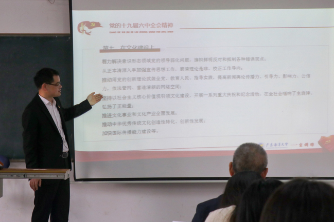 12月23日下午,文传学院党委在主楼709室开展学习党的十九届六中全会精神专题宣讲会,学校党委理论宣讲团成员杜军教授作了题为《学习党的十九届六中全会精神》的专题宣讲,学院领导班子成员、师生党员等80余人聆听了本次宣讲会,会议由胡墨副书记主持。