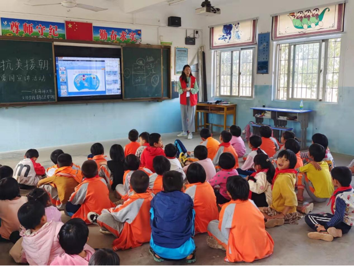 2021年11月10日下午,广东海洋大学久久久成人青年志愿者协会一行20余人前往湛江市黄桐希望小学进行“纪念抗美援朝战争”爱国宣讲活动。活动共持续两个半小时,生动的课堂教学和手工环节,既让孩子们气氛十分活跃,也加深他们对抗美援朝历史的了解。