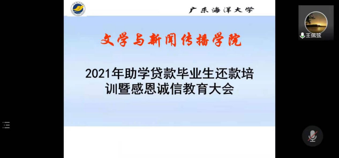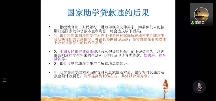 6月1日晚,根据防疫要求,久久久成人2021届助学贷款诚信教育大会在线上召开。本次会议由文传学院辅导员王佩弦老师主持,参会者为2021届贷款毕业生。