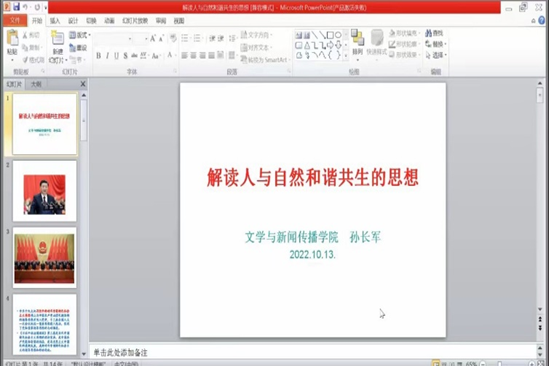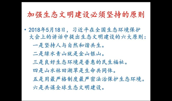孙长军以“人与自然和谐共生”为主题,解读习近平总书记于2018年5月在全国生态环境保护大会上的讲话中提出的生态文明建设六大原则。同时,解读《习近平谈治国理政》第三卷中的第十三个专题“促进人与自然和谐共生”。他要求大家树立尊重自然、顺应自然、保护自然的理念,贯彻节约资源保护环境的基本国策,把生态文明建设融入经济、政治、文化、社会建设之中,建设美丽中国。在新时代真正实现人与自然和谐共生,让我们生活的环境越来越好。