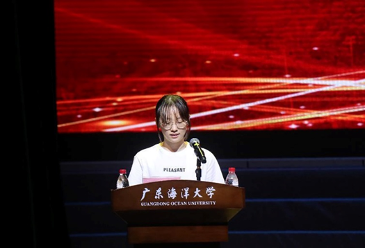 接下来,老生代表汉教1191班张明慧同学发言,她对大学生活提出两点建议:第一,怀揣梦想,用奋斗和拼搏,尽显青春之美;第二,放平心态,用坦然和豁达面对坎坷和遗憾 。张明慧基于自身三年的学习历程,将收获的经验与体会融入寄语中,为新生送上“四颗心”:感恩之心、敬畏之心、坚毅之心、不忘初心。新生代表网媒1222班林乐妍同学则从如何度过刚步入大学时的迷茫、大学的学习方法与目标、如何交友等方面提出建议,在发言的最后,她引用李大钊先生的一句话,“青年如初春,如朝日,如百卉之萌动,如利刃之新发于硎,人生最宝贵之时期也”,勉励同学们珍惜时光。